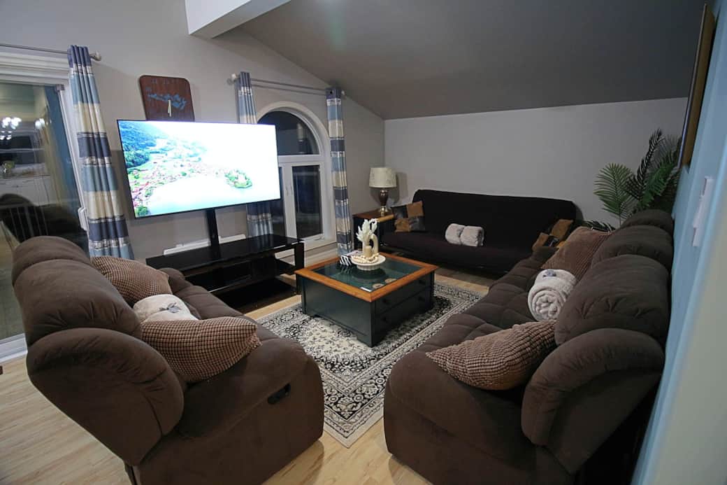 Spacious living room with two sofas and a futon for extra sleeping